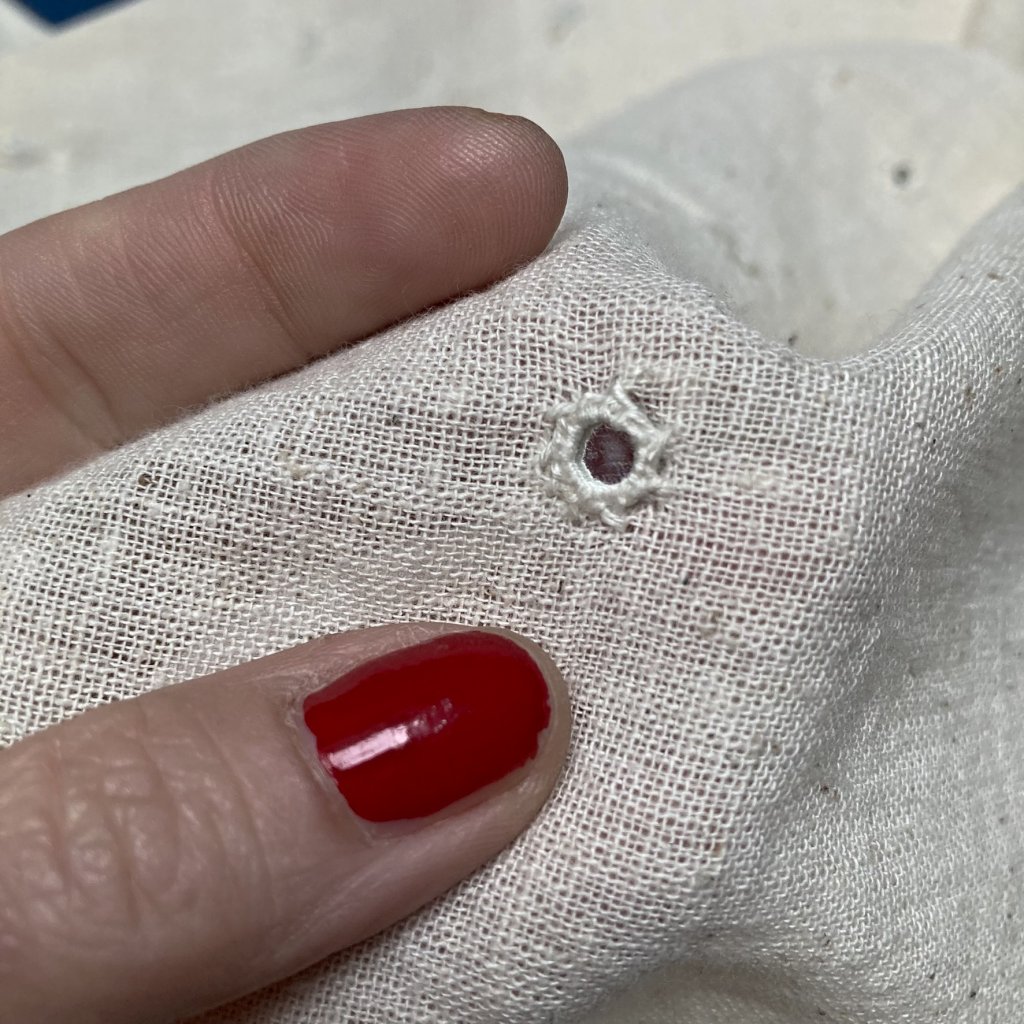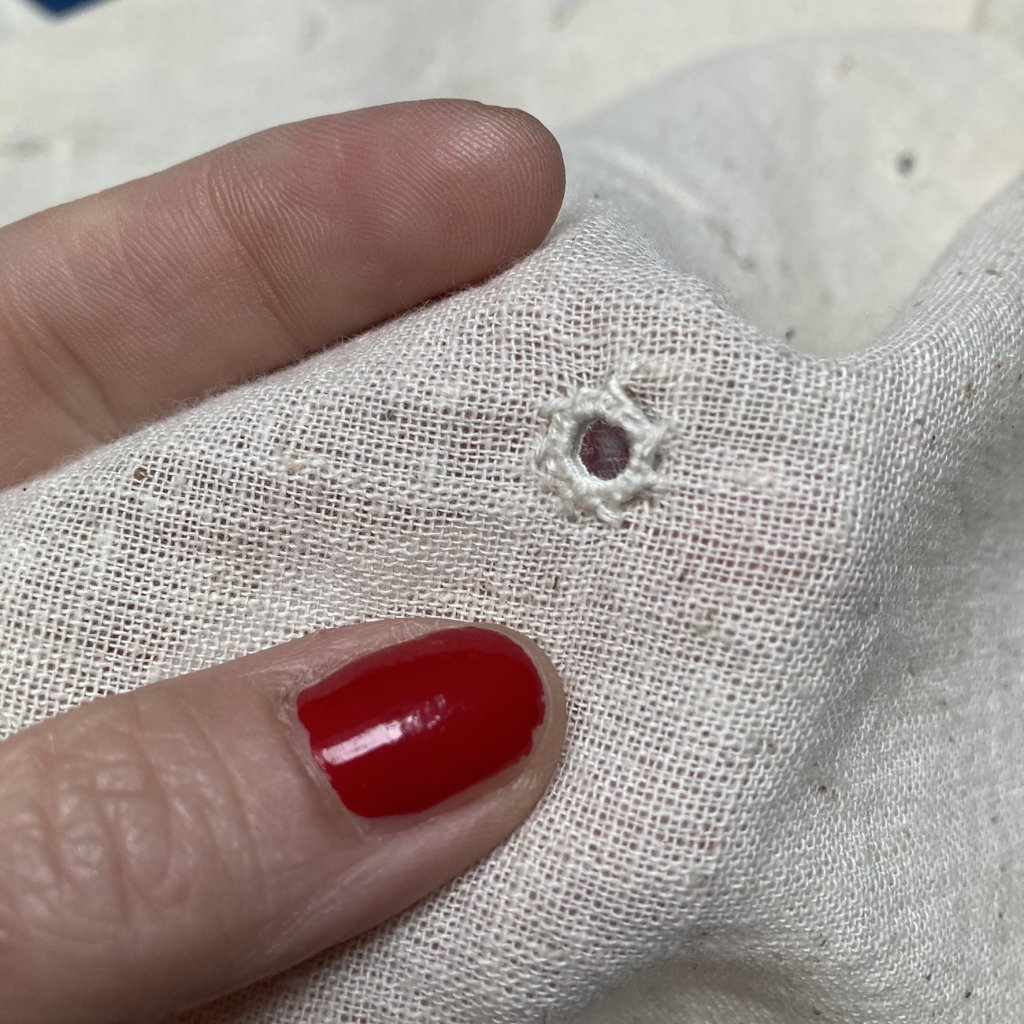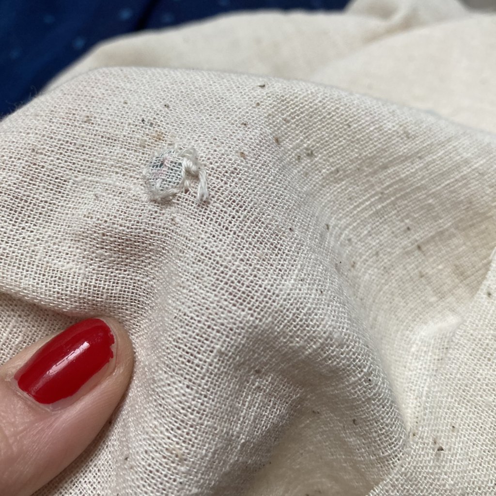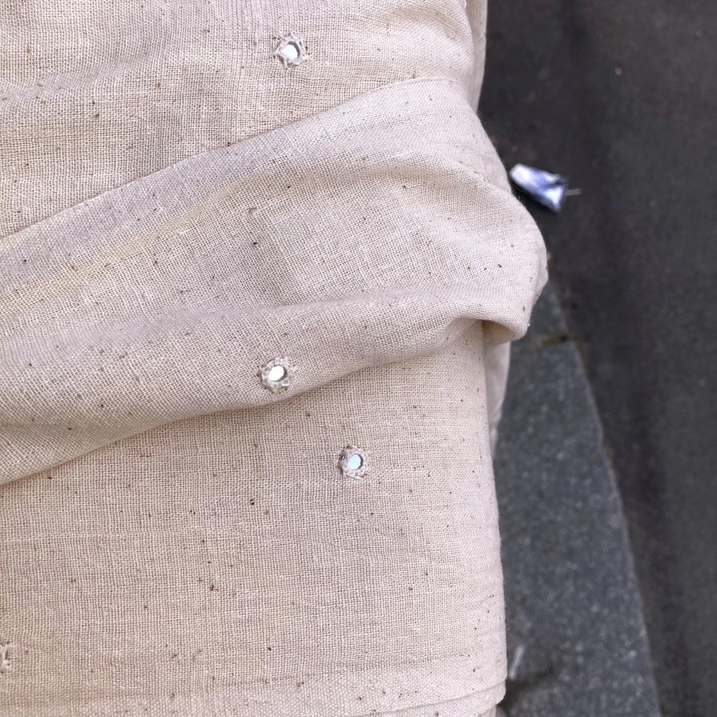 Na látce si můžete všimnout malých růžových teček. Jedná se o přenosové pero, které se v Indii používá k tomu, aby si výrobci vyznačili, kde mají zrcátka vyšít. Tyto značky se během několika praní vyperou