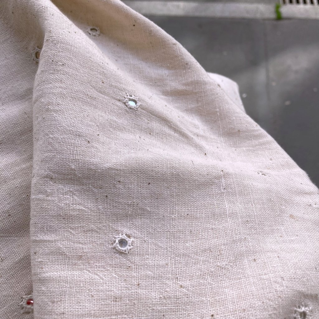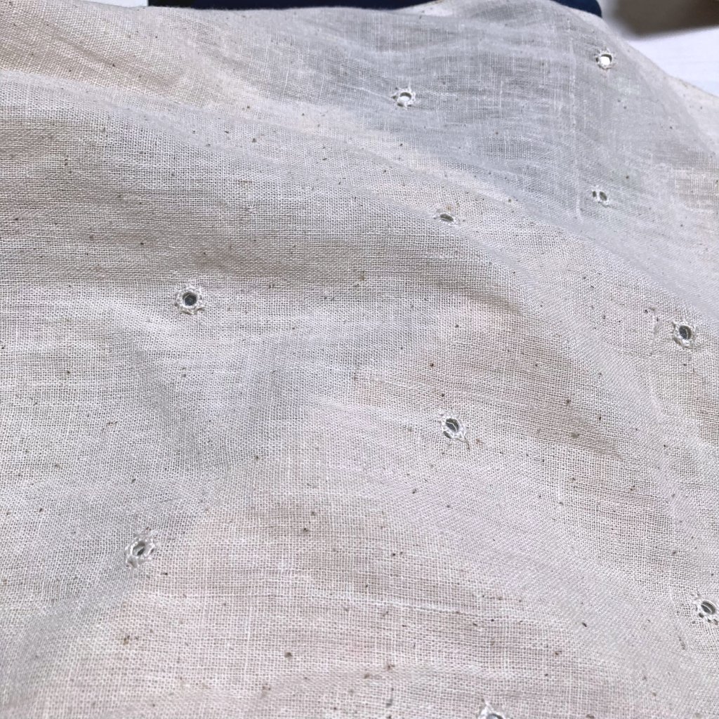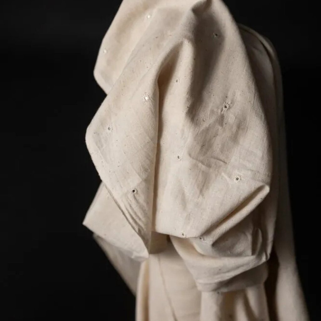 Jedinečná ručně tkaná látka z přírodní bavlny Kala v barvě ecru. Na látce jsou ručně vyšita skleněná zrcátka zvaná Abhla. Abhla v překladu znamená „kousky oblohy“, takže se oblékněte do látky, která odráží oblohu!