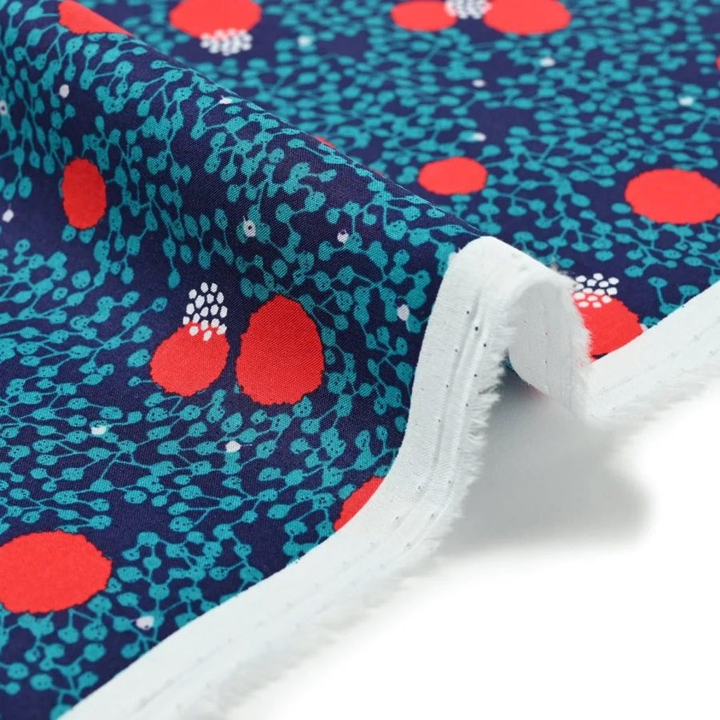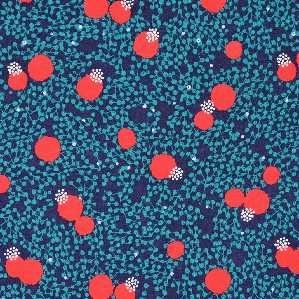 podklad hodně tmavě modrý, možná trochu do modrofilavé...červené větší bobule s bílými tečkami, ostatní tyrkysové