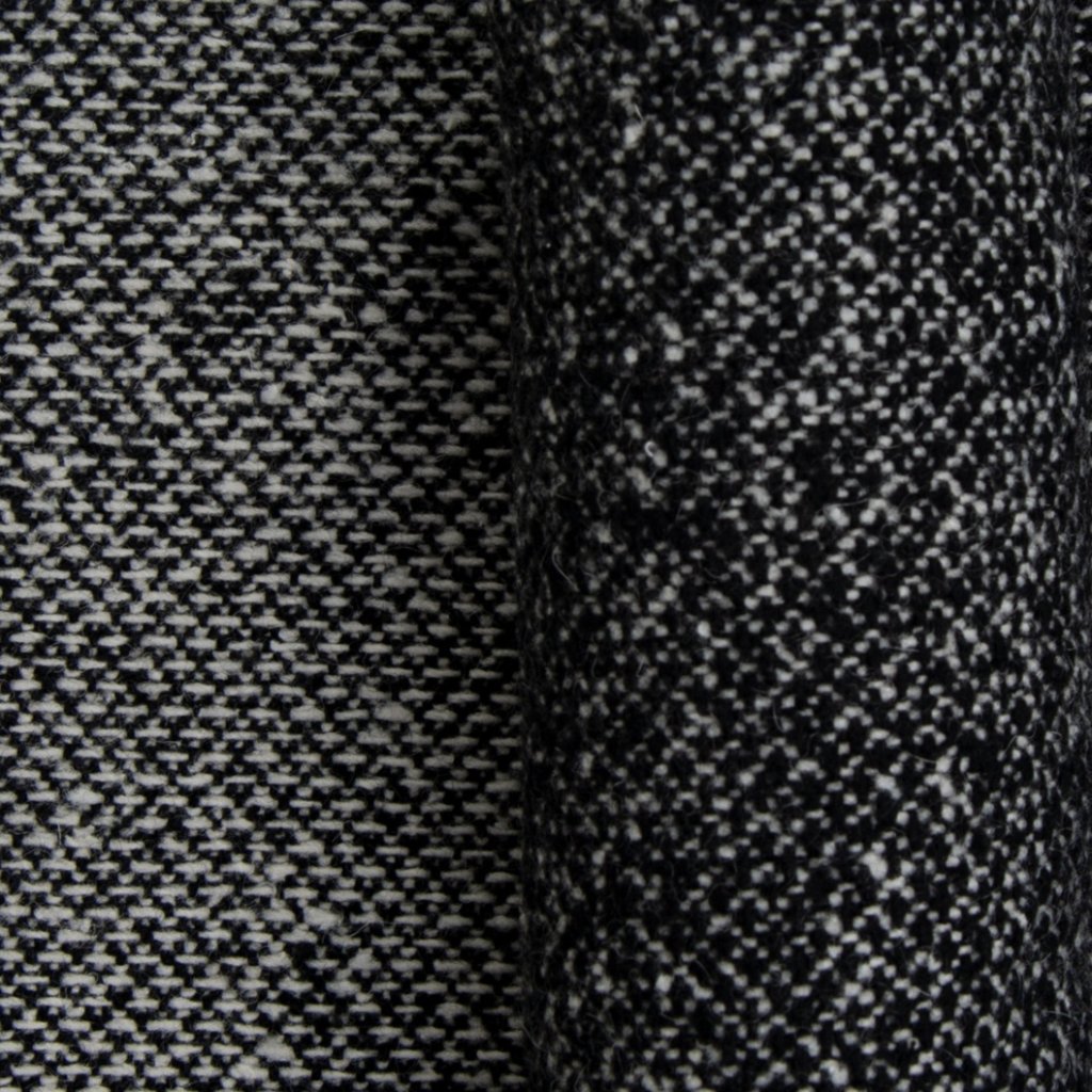 černá a smetanová vlněná tkanina s tečkami hraje na jemnost nepravidelné struktury, kde se prolínají černé a smetanové nitě., tato tkanina s tečkami vytváří živý efekt...