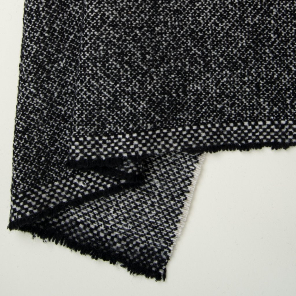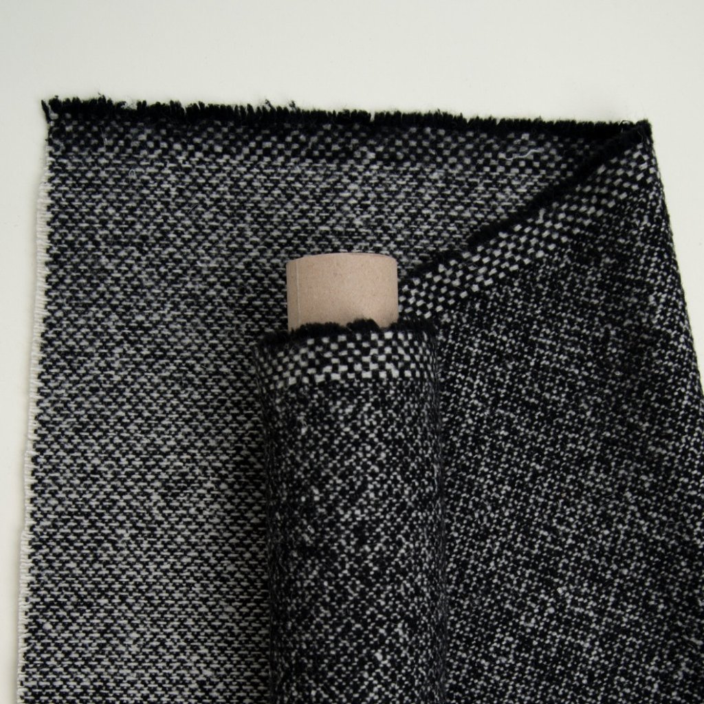 černá a smetanová vlněná tkanina s tečkami hraje na jemnost nepravidelné struktury, kde se prolínají černé a smetanové nitě, tato tkanina s tečkami vytváří živý efekt...