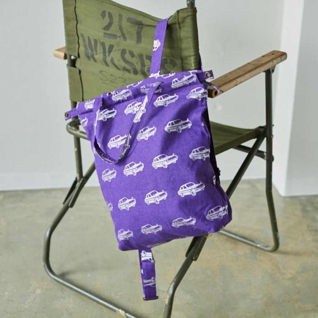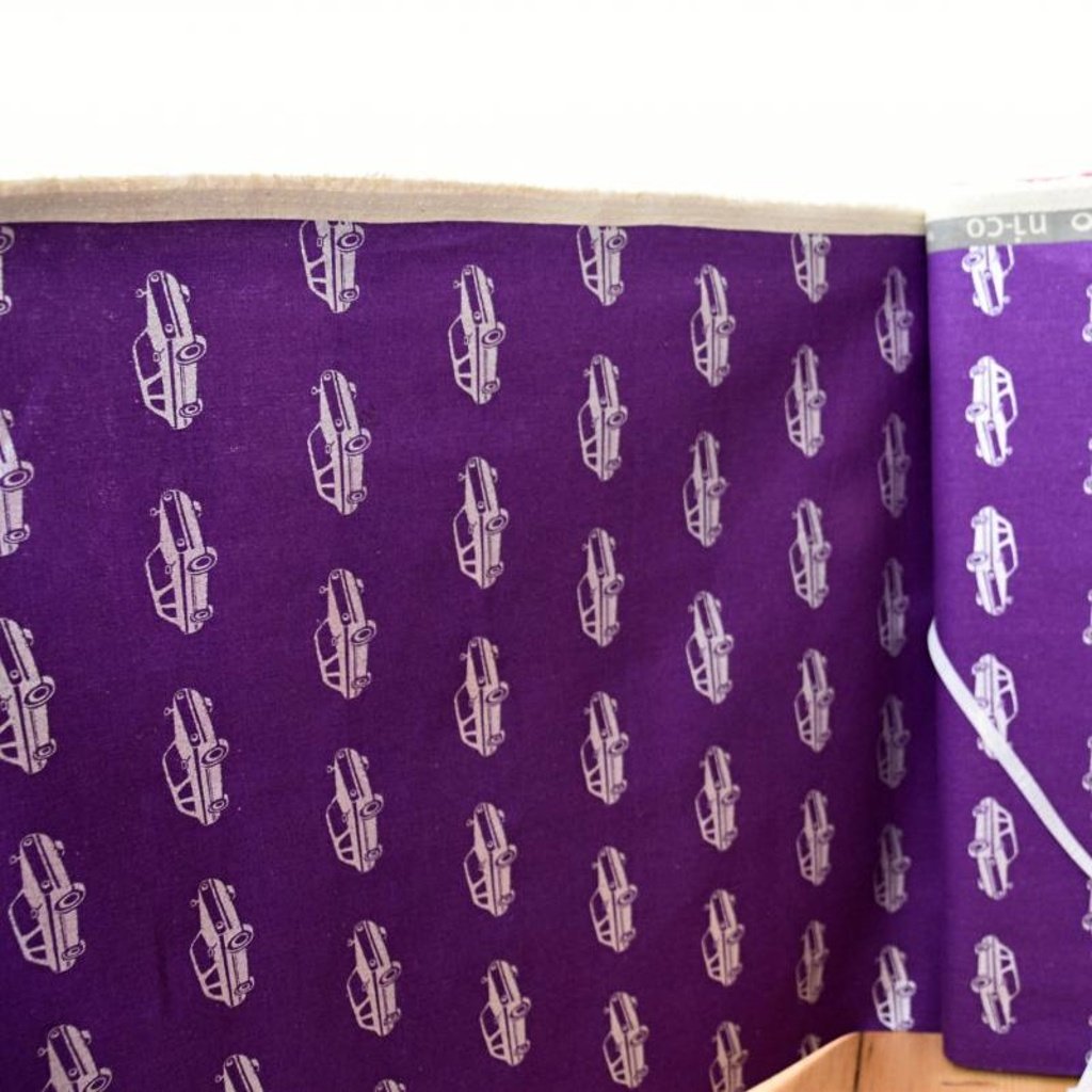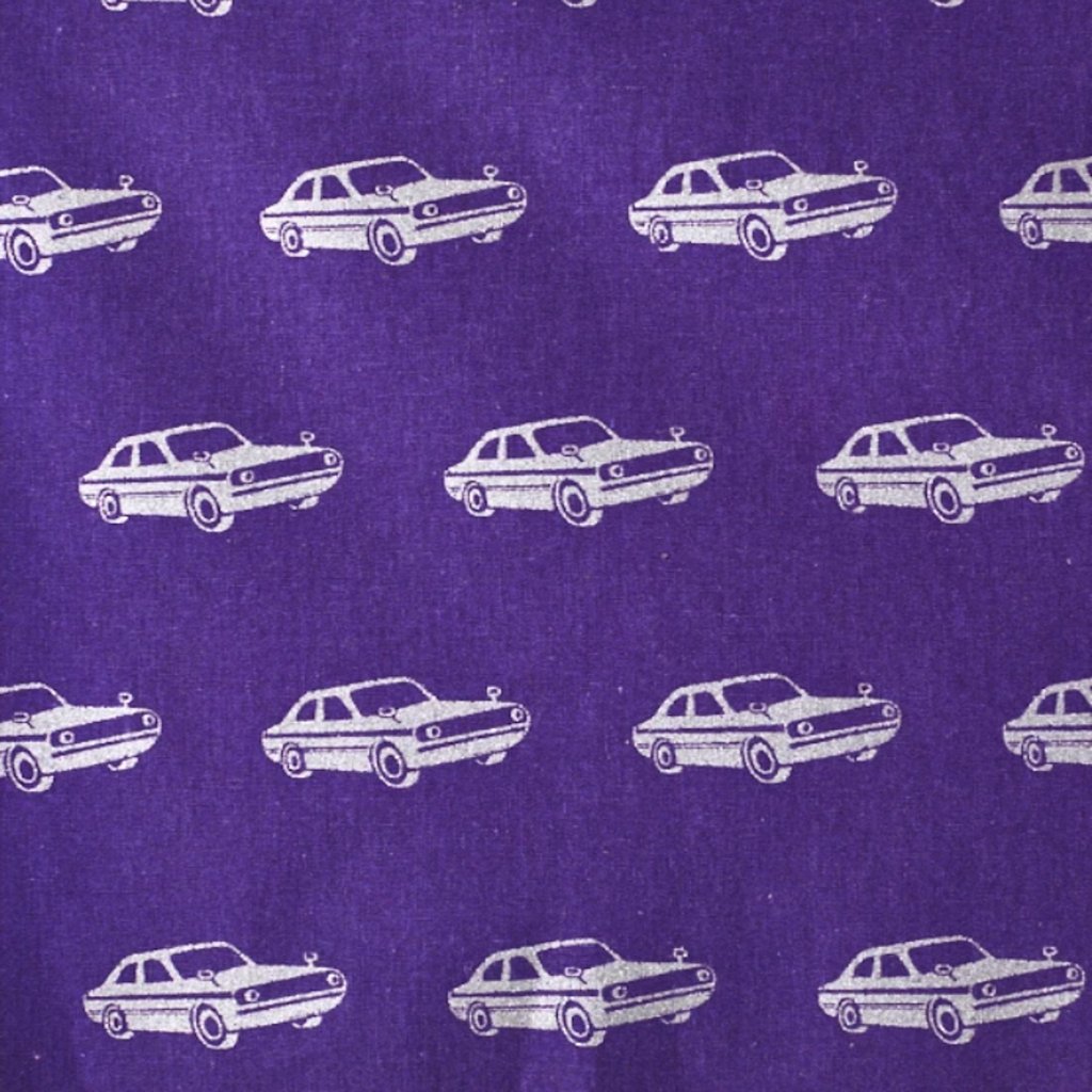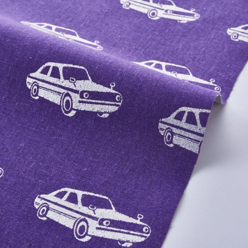 klasické echinovské plátno - pevnější směs bavlny a lnu, fialový podklad, stříbrné auto