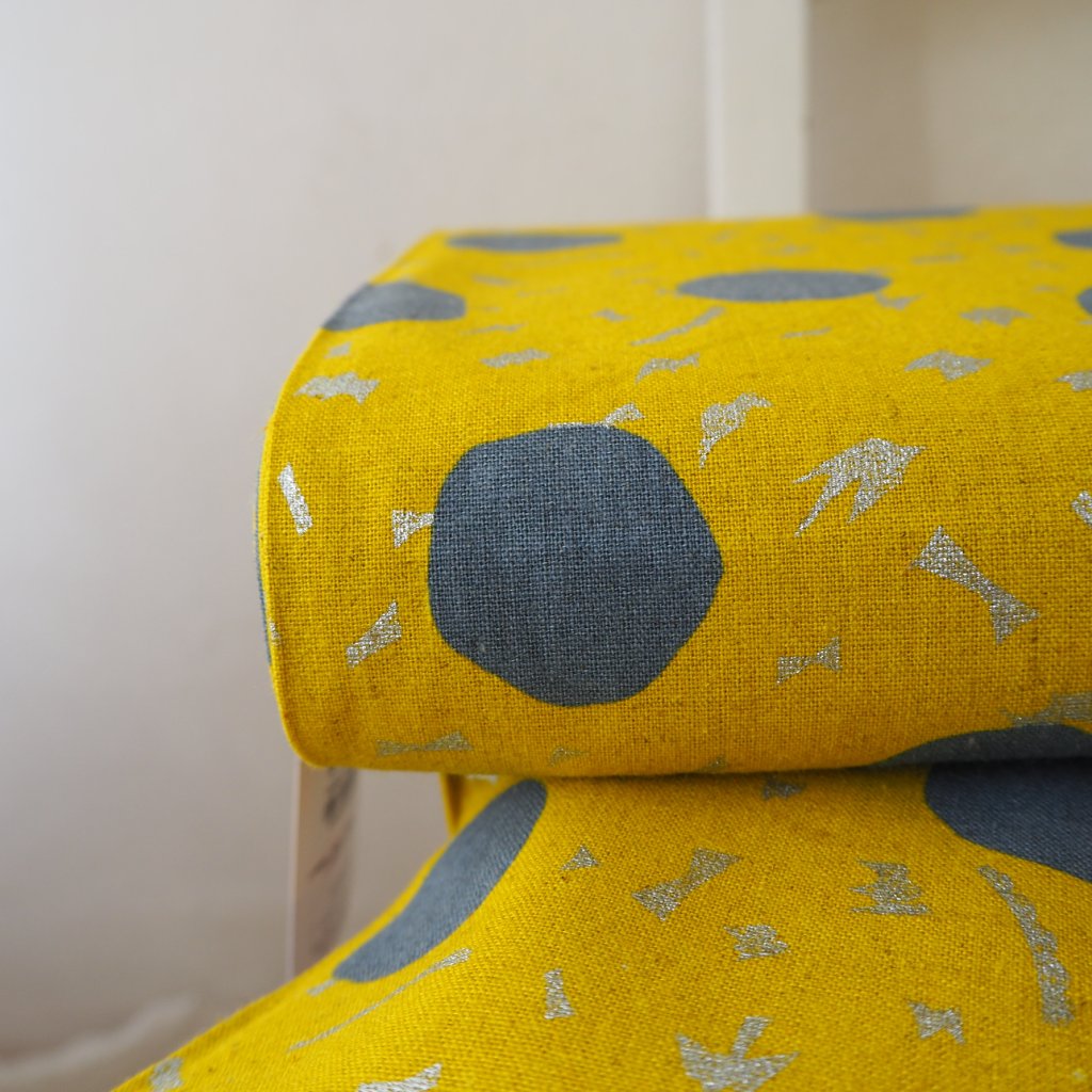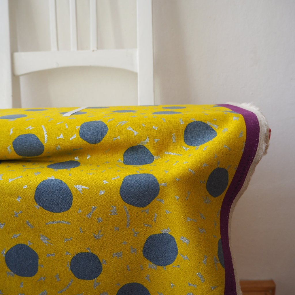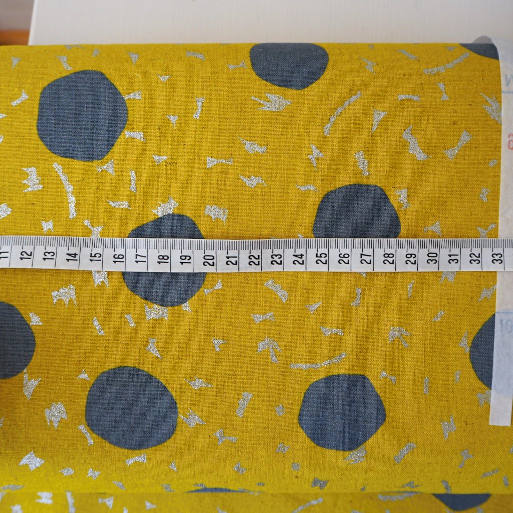 na žlutém podkladu šedé puntíky, cca 4cm, drobné třpytivé tvary, my tam vidíme i ptáčka......stříbrný třpyt