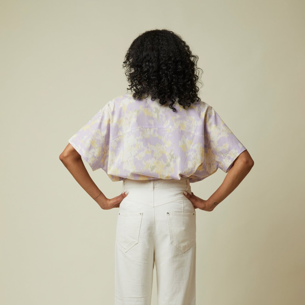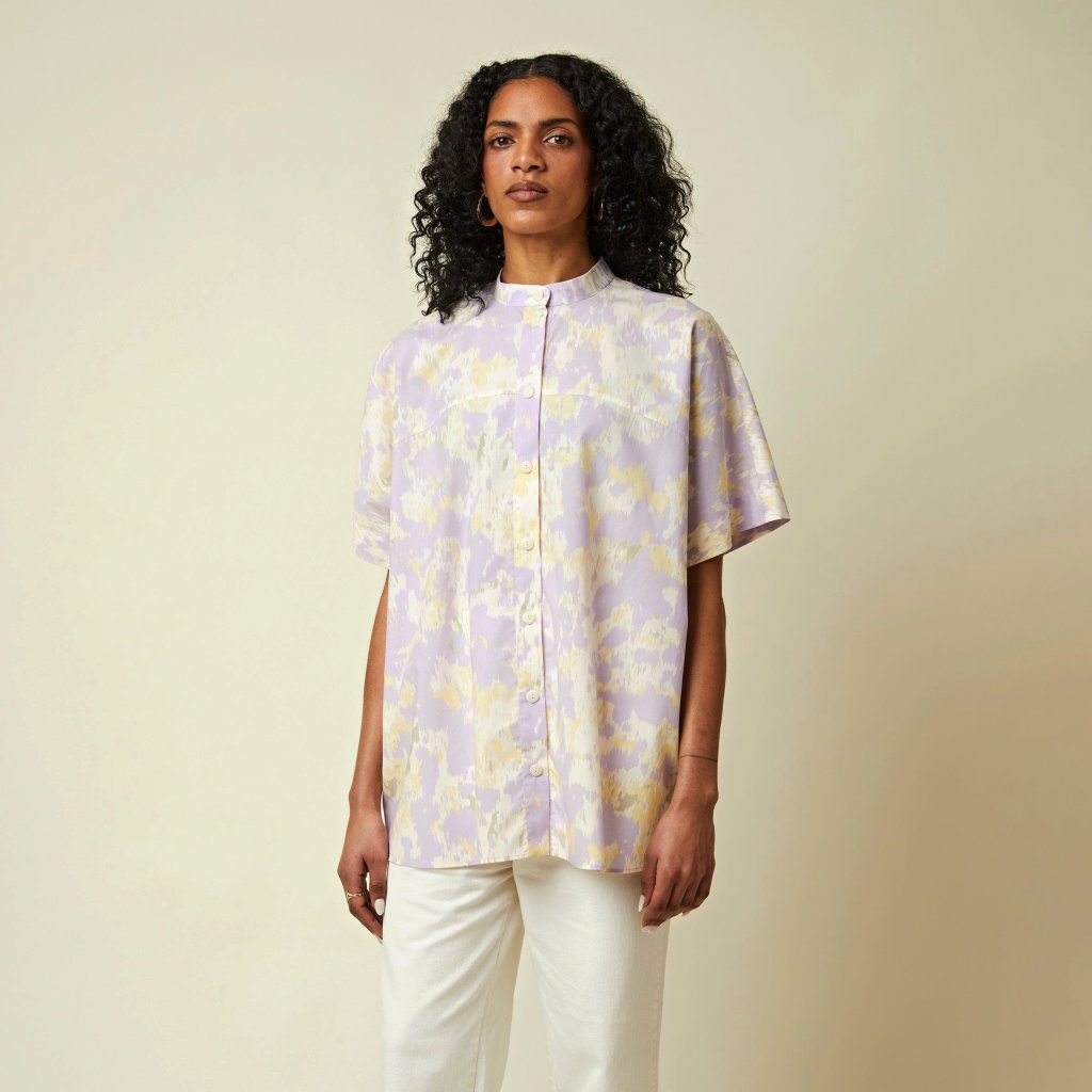 uvolněný střih, který představuje dokonalou rovnováhu mezi strukturou a lehkostí. Lichotivý přední a zadní sedlo, krátké rukávy, ideální pro nošení s tričkem pod ním nebo přímo na kůži v létě, stojací límec dodává nádech decentní elegance, zapínání na knoflíky v duchu klasické košilové výroby. Dokončeno plochými švy, které zvyšují celkový dojem.