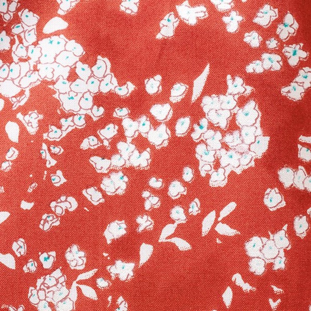 jemné, lehce průsvitné plátýnko, batist, tlumená červená a tyrkysové středy kvítků, sem tam perleť