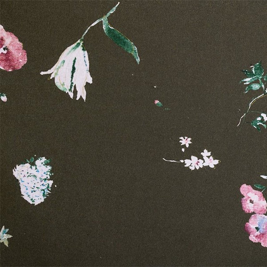 tmavě hnědý podklad,.....květy a lístky a jejich obrysy zelené, tavě růžové, bílé.....sem tam zlatá linka