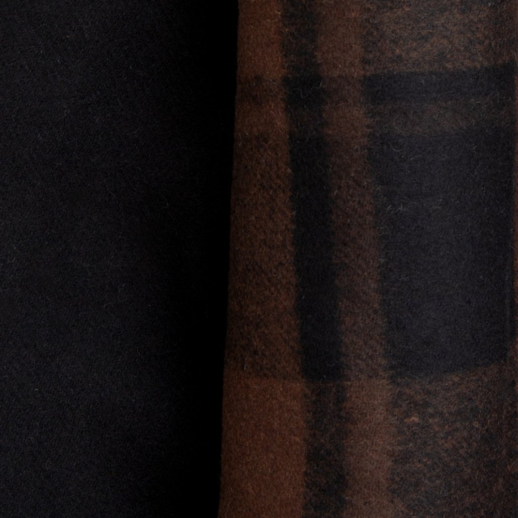 velké kostky kombinují teplo zářivé hnědé barvy s hloubkou černé, čímž vytvářejí grafický a nadčasový vzhled... tato vlněná látka je ideální pro šití vzorů, jako jsou kabáty, pláště nebo rovně střižené sako, a dodává charakter výrazným kouskům, přičemž zůstává snadno kombinovatelná.