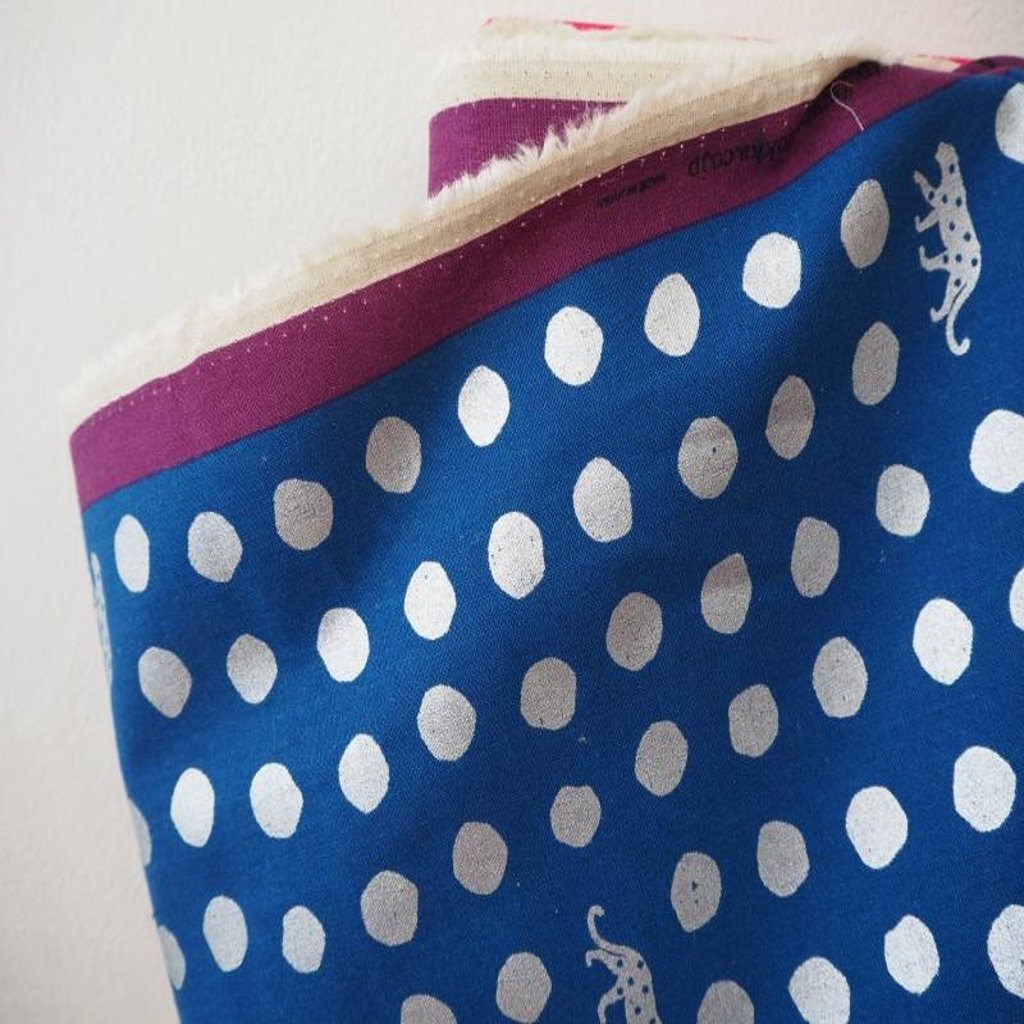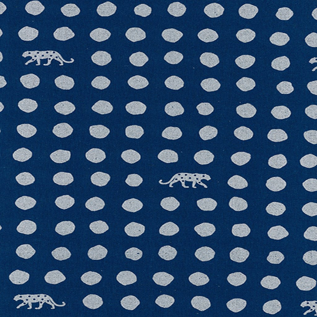 modrý podklad, stříbrný tisk nepravidelných puntíků a panterů