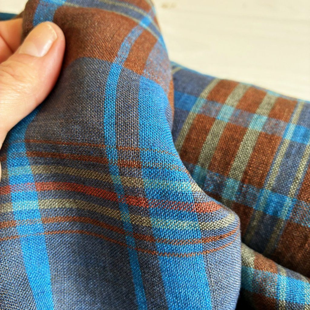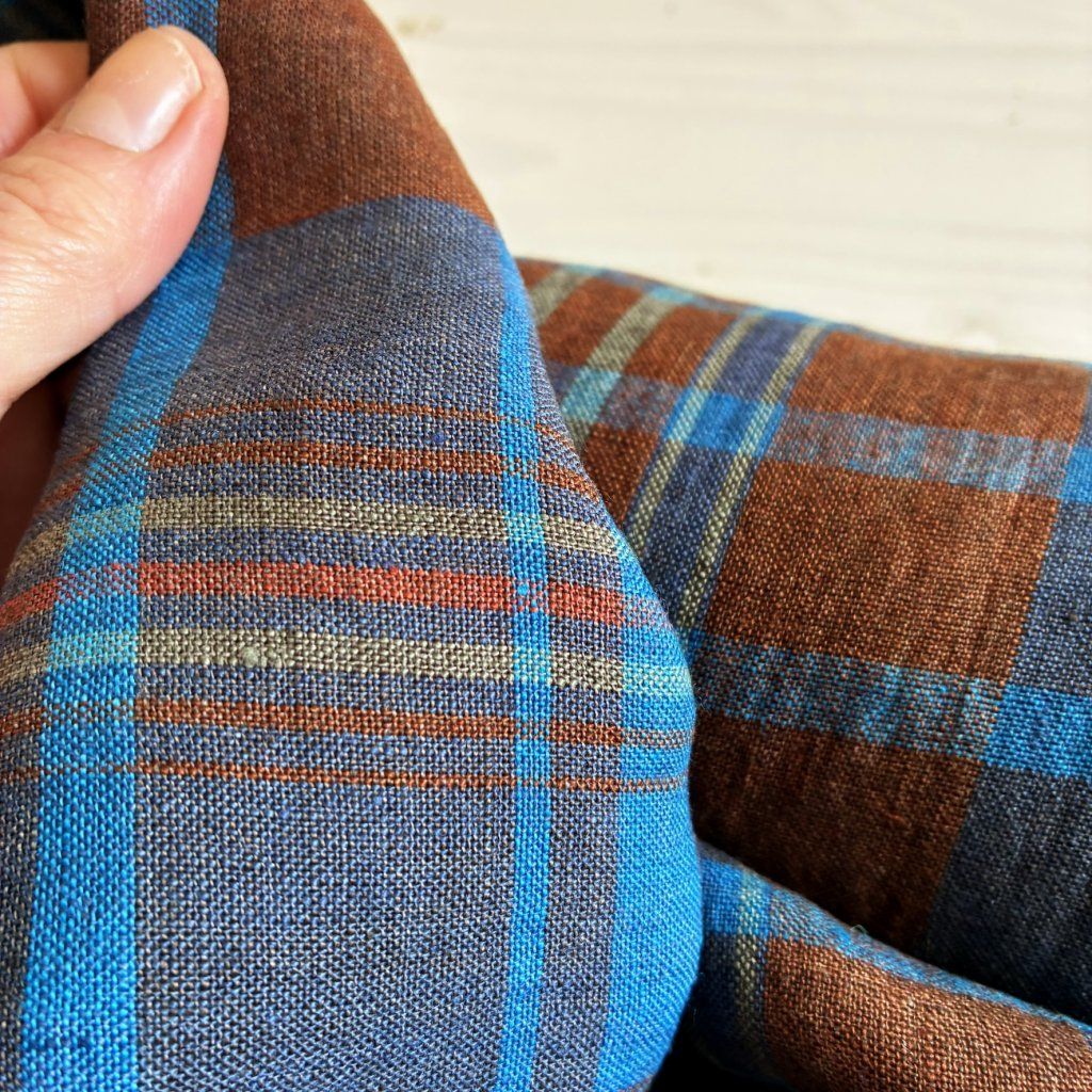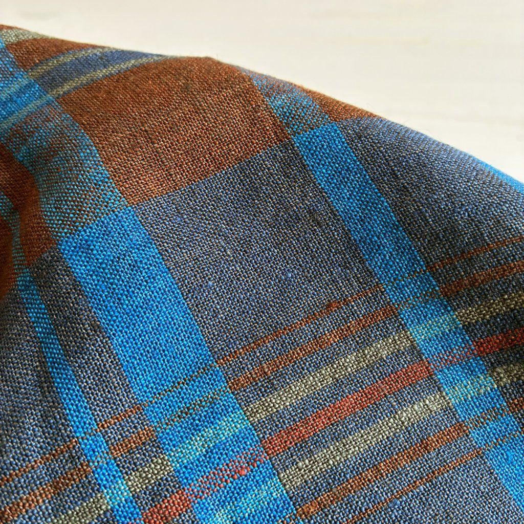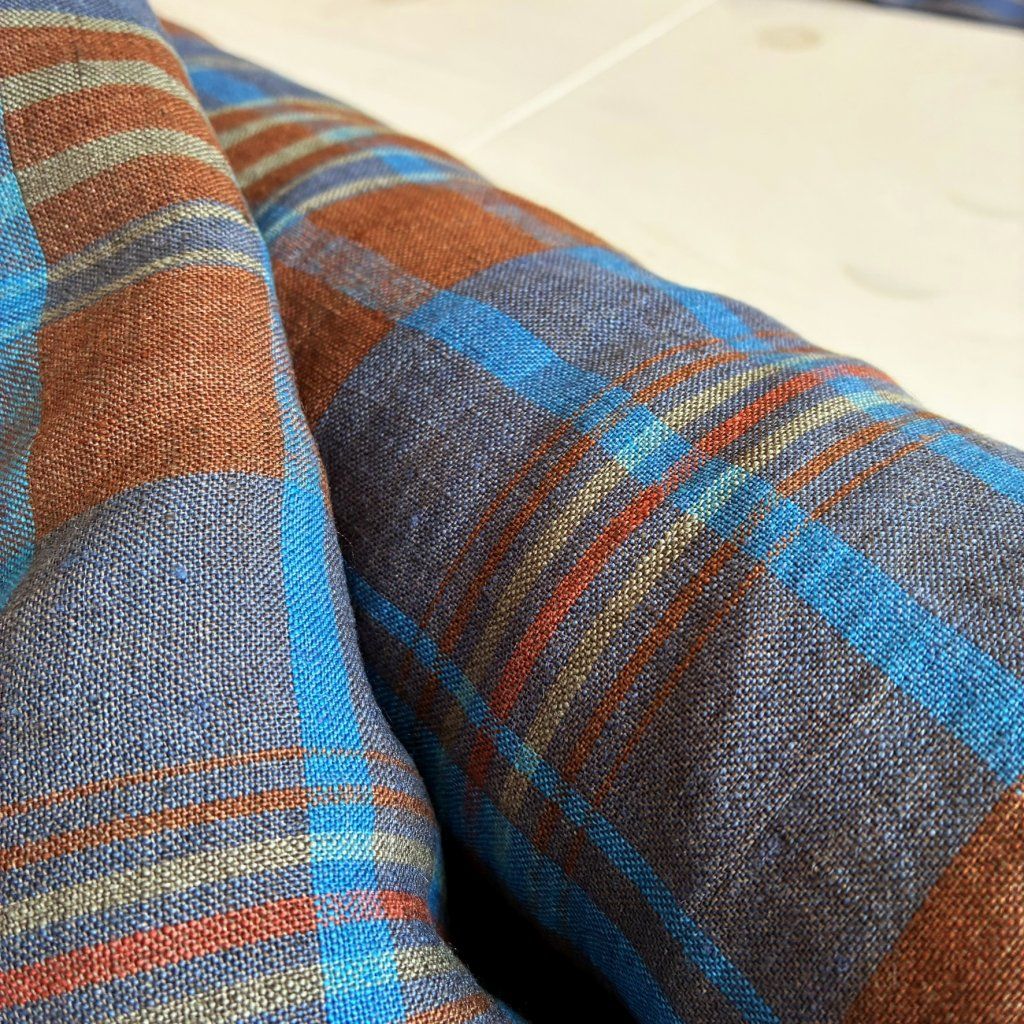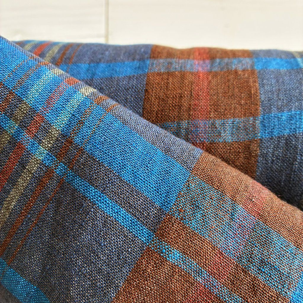 krásný tkaný len, základní barvy díky vzájemnému prolínání při tkaní vytváří další odstíny...sytý a jasný odstín modré a spolu s hnědou vytváří dokonaé svěží kombinaci a přitom si zachovávají decentní charakter