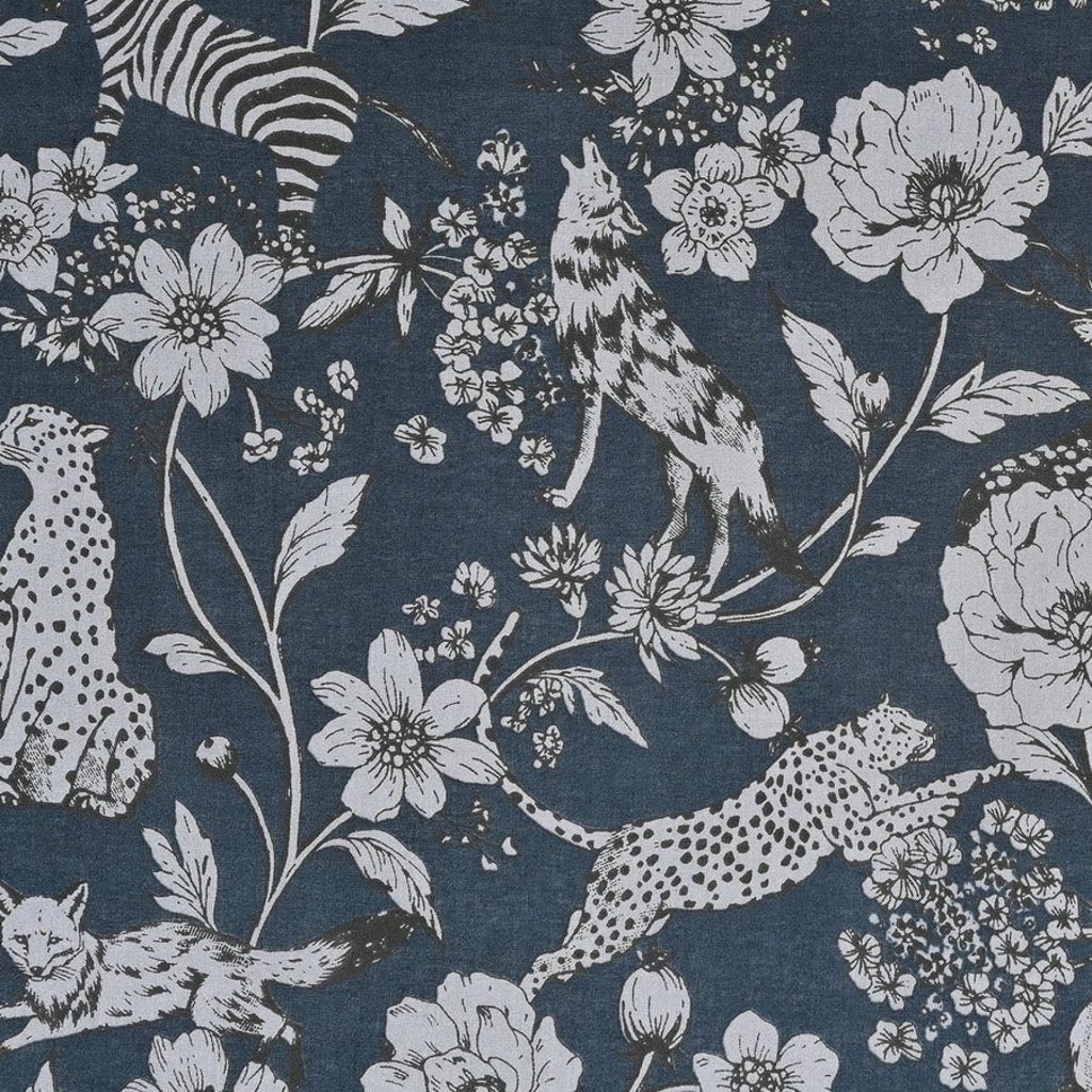 podklad jasně hodně tmavě modrý, možná šedo modrý, šedé motivy s černými obrysy